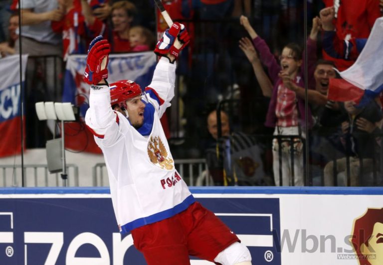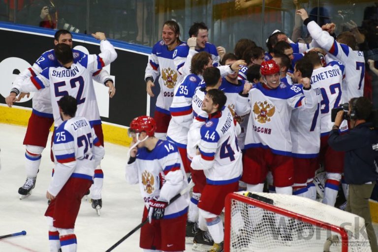 Ruskí hokejisti sa radujú z gólu v sieti Ruska počas finálového zápasu na svetovom šampionáte v Minsku. Foto: SITA/AP