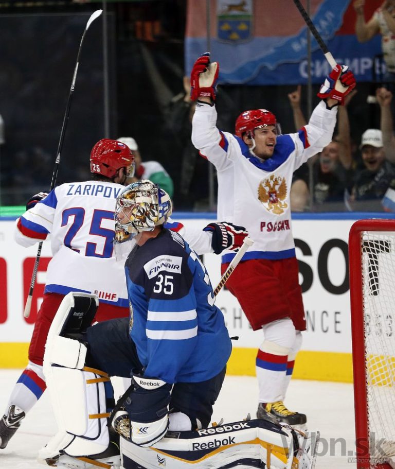 Ruský útočník Sergej Širokov sa raduje z gólu v sieti fínskeho brankára Pekku Rinneho počas finálového zápasu na MS v hokeji. Foto: SITA/AP