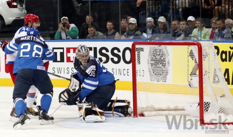 Fínsky brankár Pekka Rinne sa smutne pozerá ako puk z hokejky ruského útočníka Sergeja Širokova končí v jeho sieti počas finálového zápasu na MS v hokeji. Foto: SITA/AP