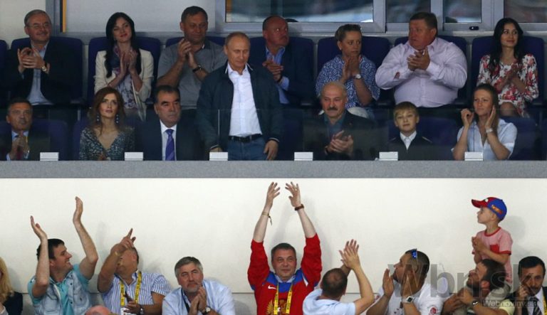 Ruský prezident Vladimir Putin a bieloruská hlava štátu Alexander Lukašenko počas finálového zápasu na svetovom šampionáte v Minsku. Foto: SITA/AP