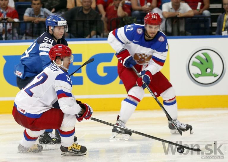 Ruskí hokejisti Arťom Anisimov a Sergej Širokov v súboji s fínskym útočníkom Ollim Palolom počas finálového zápasu na svetovom šampionáte v Minsku. Foto: SITA/AP