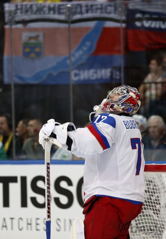 Ruský brankár Sergej Bobrovský chytá puk po strele fínskeho útočníka Iira Pakarinena počas finálového zápasu na svetovom šampionáte v Minsku. Foto: SITA/AP