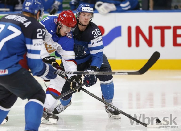 Fínsky útočník Jori Lehterä bojuje o puk s ruskými hokejistami počas finálového zápasu na svetovom šampionáte v Minsku. Foto: SITA/AP