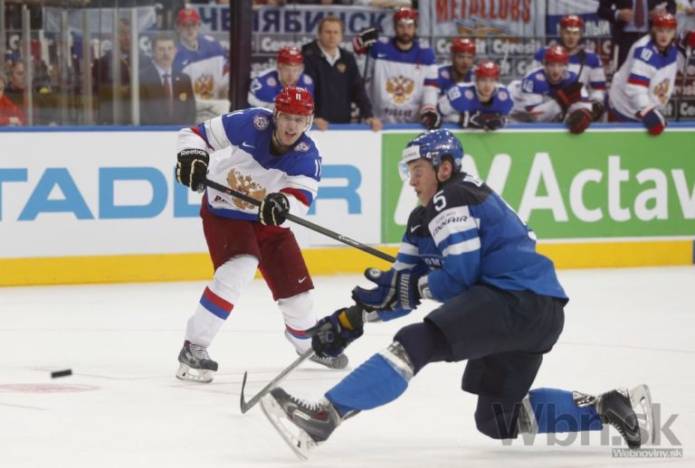 Fínsky obranca Atte Ohtamaa sa snaží zablokovať strelu ruského útočníka Jevgenija Malkina počas finálového zápasu na MS v hokeji. Foto: SITA/AP