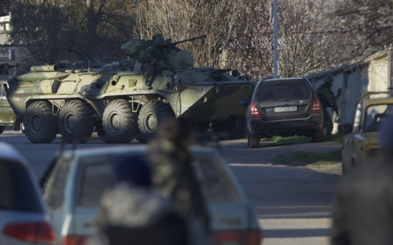 Rusi prišli do leteckej základne na obrnených vozidlách a sú vyzbrojení automatickými zbraňami a ohlušovacími granátmi. Foto: SITA/AP