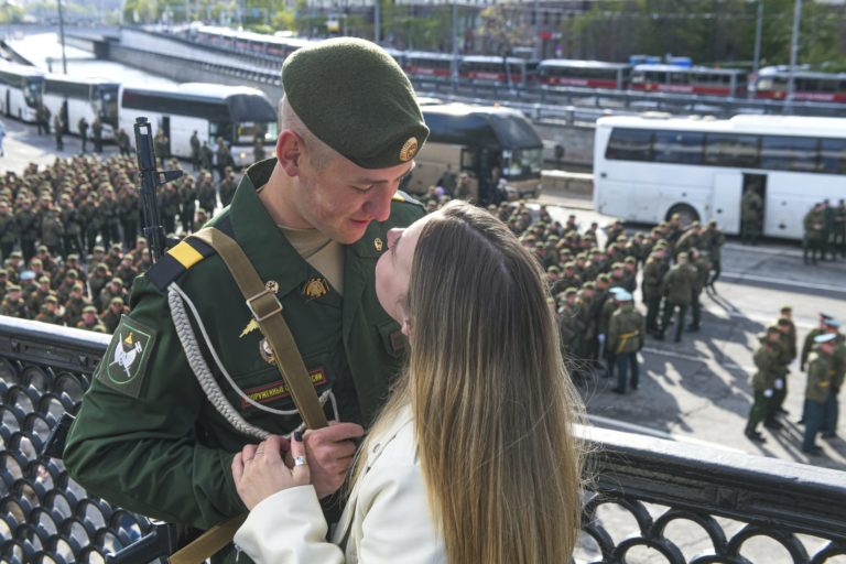 Ruský vojak a mladá žena prežívajú nežnú chvíľu, keď ostatní vojaci čakajú na vojenskú prehliadku pri príležitosti Dňa víťazstva v Moskve, Rusko, vo štvrtok 9. mája 2024. Foto: SITA/AP