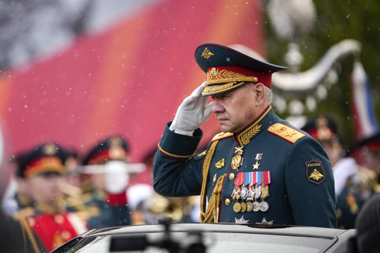 Ruský minister obrany Sergej Šojgu sa vezie v aute Aurus po Červenom námestí počas vojenskej prehliadky pri príležitosti Dňa víťazstva v Moskve vo štvrtok 9. mája 2024 pri príležitosti 79. výročia ukončenia druhej svetovej vojny. Foto: SITA/AP