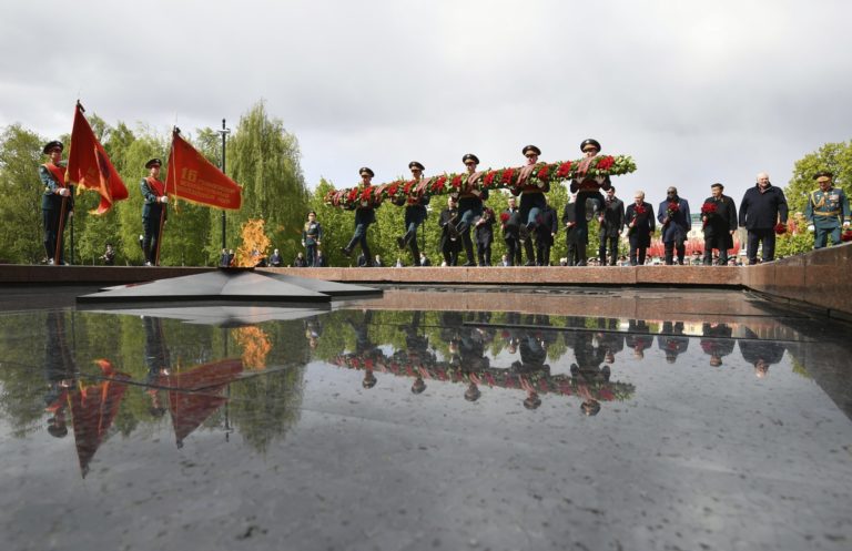 Ruský prezident Vladimir Putin (skrytý) a zahraniční lídri sa zúčastňujú na slávnostnom kladení vencov k Hrobu neznámeho vojaka v Alexandrovej záhrade v Deň víťazstva, ktorým si pripomíname 79. výročie víťazstva nad nacistickým Nemeckom v druhej svetovej vojne, neďaleko Kremľa v Moskve vo štvrtok 9. mája 2024. Foto: Ramil Sitdikov, Sputnik, Kremlin Pool Photo via AP