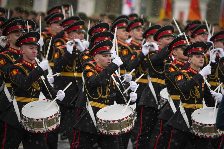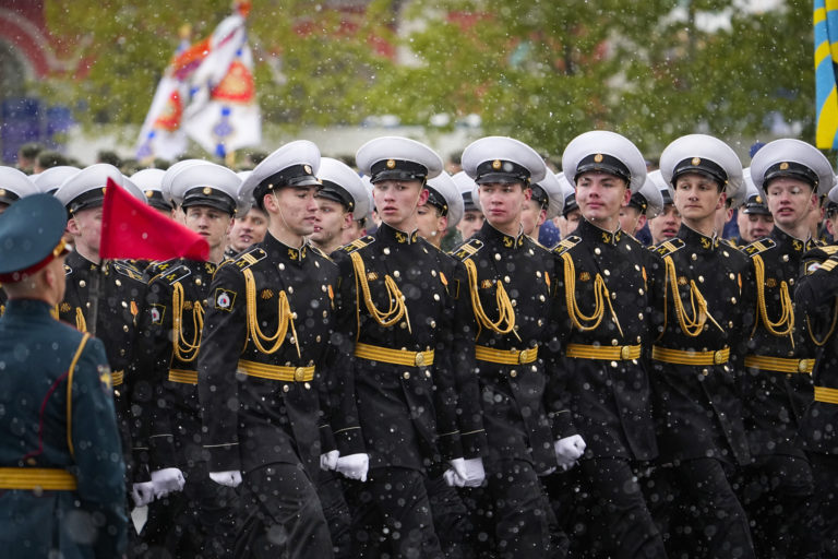 Vojenskí kadeti pochodujú počas vojenskej prehliadky pri príležitosti Dňa víťazstva na Palácovom námestí v ruskom Petrohrade vo štvrtok 9. mája 2024 pri príležitosti 79. výročia ukončenia druhej svetovej vojny. Foto: SITA/AP
