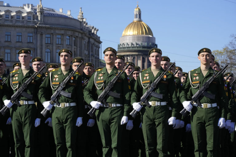 Vojenskí kadeti sa zúčastňujú na vojenskej prehliadke pri príležitosti Dňa víťazstva na Palácovom námestí v ruskom Petrohrade vo štvrtok 9. mája 2024 pri príležitosti 79. výročia ukončenia druhej svetovej vojny. Foto: SITA/AP
