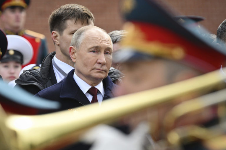 Ruský prezident Vladimir Putin (uprostred) sa zúčastňuje na slávnostnom kladení vencov k Hrobu neznámeho vojaka po vojenskej prehliadke pri príležitosti Dňa víťazstva v Moskve vo štvrtok 9. mája 2024. Foto: Ramil Sitdikov, Sputnik, Kremlin Pool Photo via AP