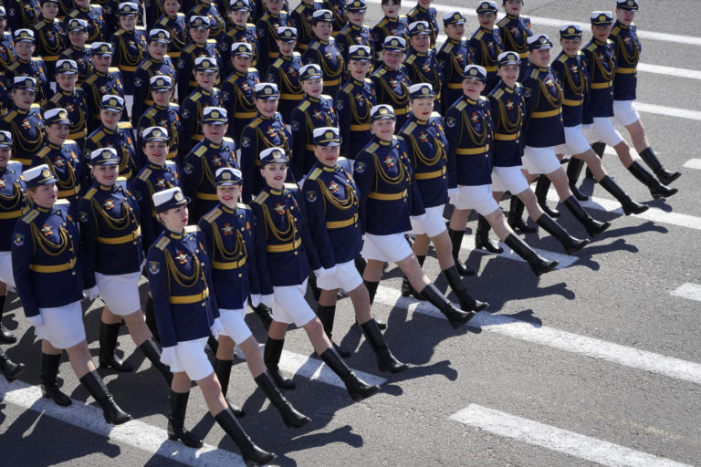Ruské vojačky pochodujú počas vojenskej prehliadky pri príležitosti Dňa víťazstva na Červenom námestí v Moskve vo štvrtok 9. mája 2024 pri príležitosti 79. výročia ukončenia druhej svetovej vojny. Foto: SITA/AP
