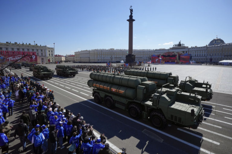 Odpaľovacie zariadenia ruského protilietadlového raketového systému S-400 sa kotúľajú počas vojenskej prehliadky pri príležitosti Dňa víťazstva na Palácovom námestí v ruskom Petrohrade vo štvrtok 9. mája 2024 pri príležitosti 79. výročia ukončenia druhej svetovej vojny. Foto: SITA/AP
