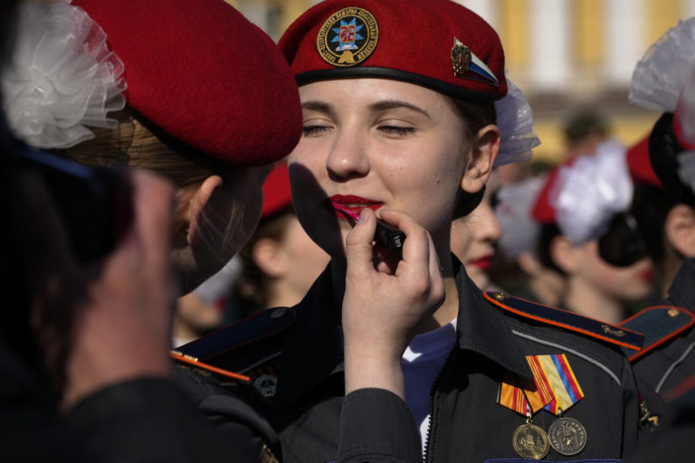 Kadetka ruského ministerstva pre mimoriadne situácie pred vojenskou prehliadkou na Deň víťazstva na Palácovom námestí v ruskom Petrohrade vo štvrtok 9. mája 2024 pri príležitosti 79. výročia ukončenia druhej svetovej vojny. Foto: SITA/AP