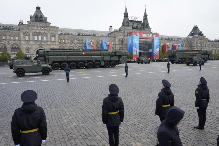Ruské balistické rakety RS-24 Jars sa kotúľajú počas vojenskej prehliadky pri príležitosti Dňa víťazstva v Moskve, Rusko, vo štvrtok 9. mája 2024, pri príležitosti 79. výročia ukončenia druhej svetovej vojny. Foto: SITA/AP