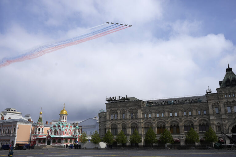 Stíhačky ruského letectva Su-25 prelietavajú nad Červeným námestím a zanechávajú za sebou dymové stopy vo farbách štátnej vlajky počas vojenskej prehliadky pri príležitosti Dňa víťazstva v Moskve vo štvrtok 9. mája 2024 pri príležitosti 79. výročia ukončenia druhej svetovej vojny. Foto: SITA/AP