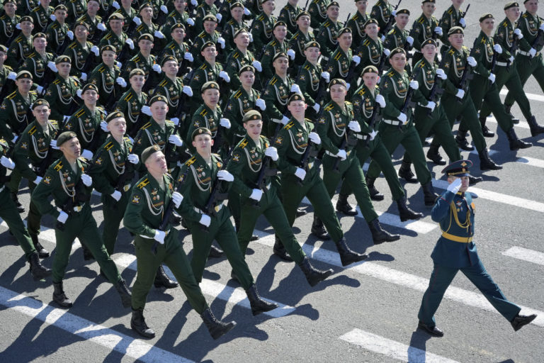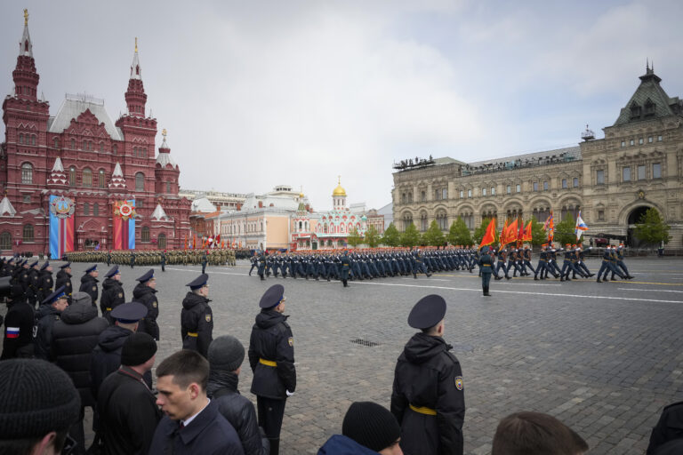 Ruskí vojenskí kadeti pochodujú počas vojenskej prehliadky pri príležitosti Dňa víťazstva v Moskve, Rusko, vo štvrtok 9. mája 2024, pri príležitosti 79. výročia ukončenia druhej svetovej vojny. Foto: SITA/AP