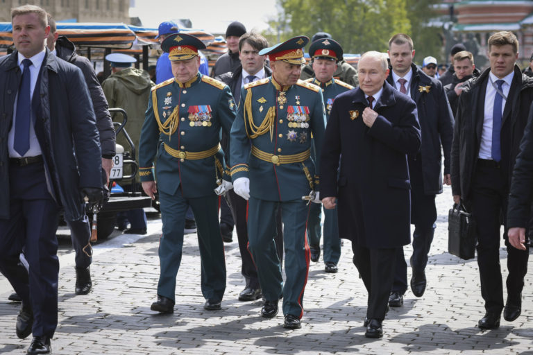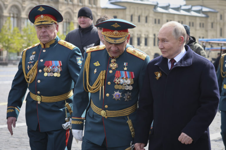 Hlavný veliteľ ruských pozemných síl Oleg Saljukov, ruský minister obrany Sergej Šojgu (uprostred) a ruský prezident Vladimir Putin odchádzajú z Červeného námestia po vojenskej prehliadke pri príležitosti Dňa víťazstva v Moskve vo štvrtok 9. mája 2024 pri príležitosti 79. výročia ukončenia druhej svetovej vojny. Foto: Mikhail Klimentyev, Sputnik, Kremlin Pool Photo via AP