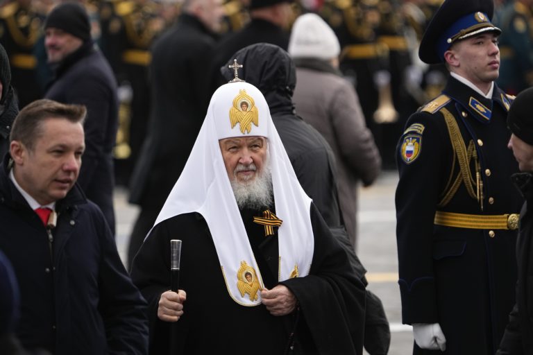Ruský pravoslávny patriarcha Kirill prichádza na vojenskú prehliadku pri príležitosti Dňa víťazstva v Moskve, Rusko, vo štvrtok 9. mája 2024, pri príležitosti 79. výročia ukončenia druhej svetovej vojny. Foto: SITA/AP