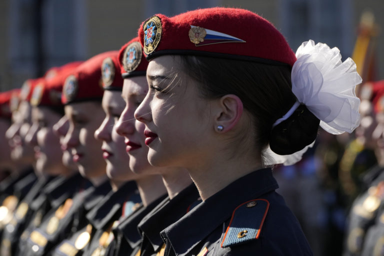 Príslušníčky ruskej armády pochodujú počas vojenskej prehliadky pri príležitosti Dňa víťazstva na Palácovom námestí v ruskom Petrohrade vo štvrtok 9. mája 2024 pri príležitosti 79. výročia ukončenia druhej svetovej vojny. Foto: SITA/AP