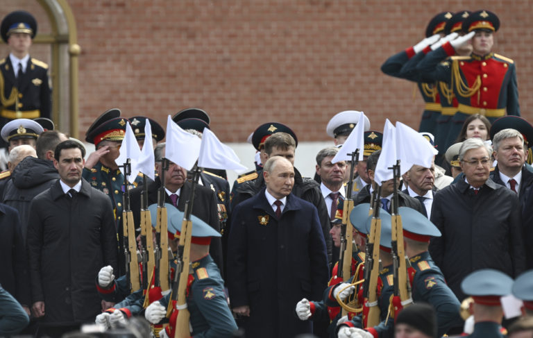 Ruský prezident Vladimir Putin (uprostred) sa zúčastňuje na slávnostnom kladení vencov k Hrobu neznámeho vojaka po vojenskej prehliadke pri príležitosti Dňa víťazstva v Moskve vo štvrtok 9. mája 2024. Vľavo prezident Turkménska Serdar Berdimuhamedov, druhý sprava stojí prezident Kazašskej republiky Kassym-Jomart Tokajev. Foto: Maxim Blinov, Sputnik, Kremlin Pool Photo via AP
