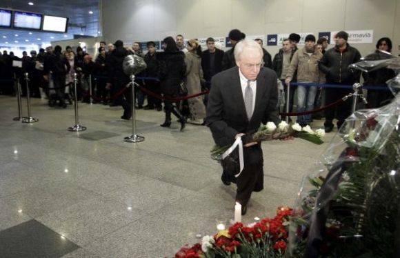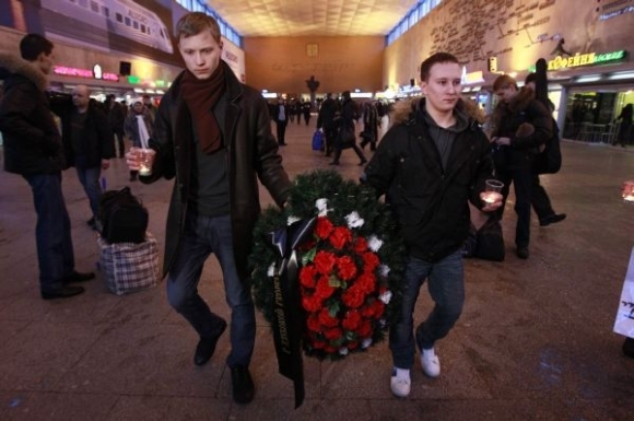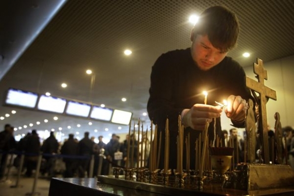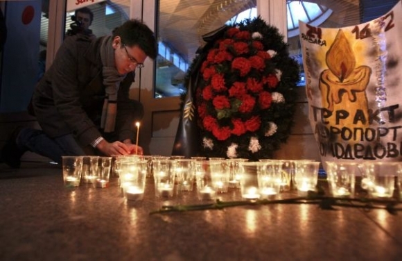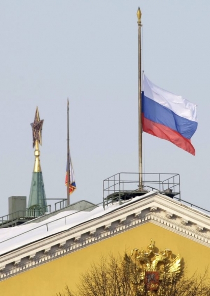Na pamiatku obetí teroristického útoku na letisko Domodedovo boli zástavy v Moskve a v celom moskovskom regióne na pol žrde, zábavné programy z televízie a rozhlasu zmizli, koncerty odložili. Moskva, 26. január 2010. Foto: SITA/AP