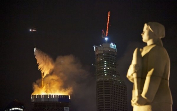 Nočný požiar na rozostavanom moskovskom mrakodrape nespôsobil väčšie škody a zrútenie stavby tak nehrozí. Veža federácie by mala mať 93 poschodí a týčiť by sa mala do výšky 360 metrov. Dokončiť ju ho mali na budúci rok. Moskva, 2. apríl 2012. Foto: SITA/AP