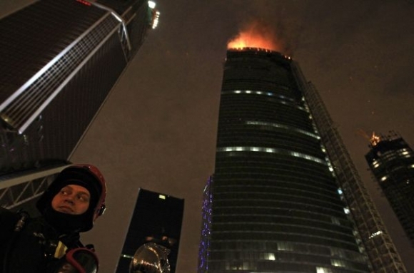 Hasičom sa plamene podarilo zlikvidovať krátko po polnoci, teda približne štyri hodín od vypuknutia ohňa na 67. poschodí nedokončeného mrakodrapu. Moskva, 2. apríl 2012. Foto: SITA/AP