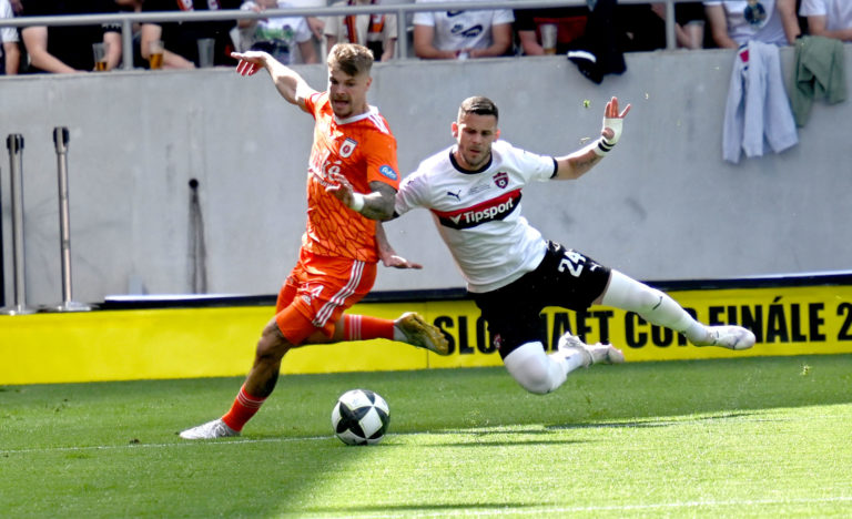 Zľava: Marek Zsigmund z MFK Ružomberok a Kristián Koštrna z FC Spartak Trnava počas finálového futbalového zápasu Slovnaft Cup 2023/2024 medzi MFK Ružomberok - FC Spartak Trnava. Košice, 1. máj 2024. Foto: SITA/Viktor Zamborský