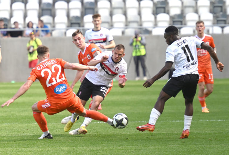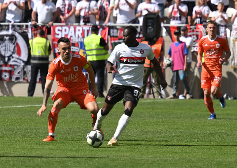 Zľava: Marek Zsigmund z MFK Ružomberok a Kelvin Ofori z FC Sparta Trnava počas finálového futbalového zápasu Slovnaft Cup 2023/2024 medzi MFK Ružomberok - FC Spartak Trnava. Košice, 1. máj 2024. Foto: SITA/Viktor Zamborský