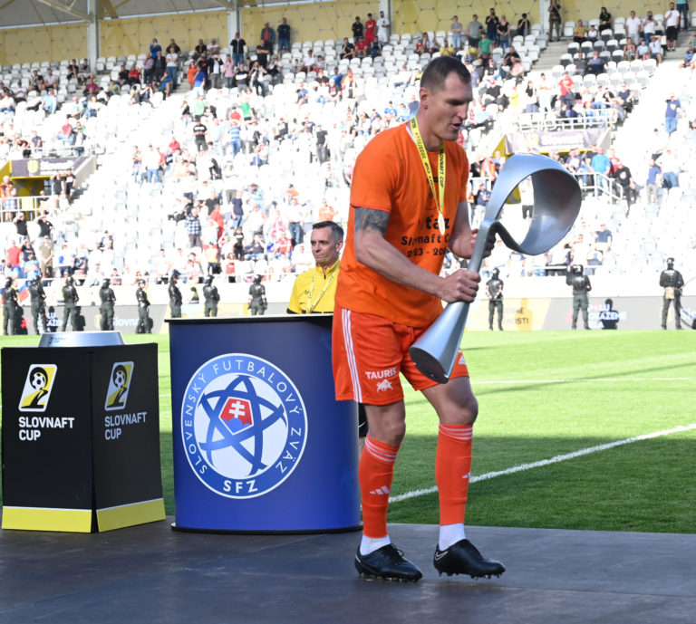 Ján Maslo z MFK Ružomberok s pohárom pre víťaza po vyhratom finálovom futbalovom zápase Slovnaft Cup 2023/2024 medzi MFK Ružomberok - FC Spartak Trnava. Košice, 1. máj 2024. Foto: SITA/Viktor Zamborský