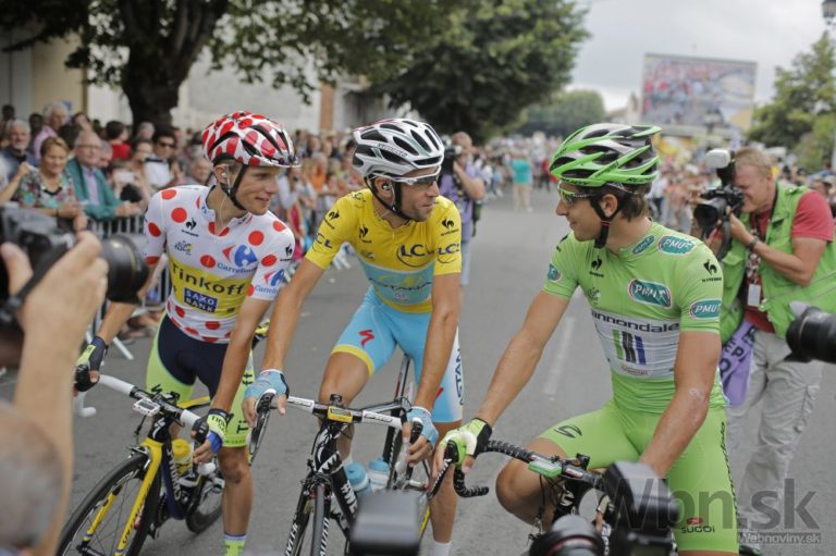 Zľava: Rafal Majka, Vincenzo Nibali a Peter Sagan pred 19. etapou Tour de France, ktorá merala 208,5 kilometra a viedla z Maubourguet Pays du Val d´Adour do Bergeracu. Foto: SITA/AP