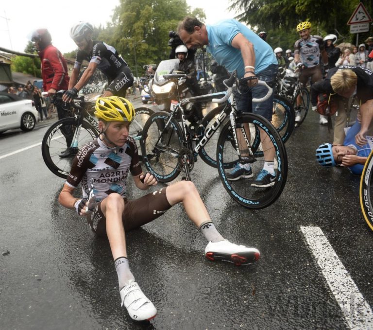 Do pádu pred cieľom 19. etapy 101. ročníka Tour de France sa zaplietol aj francúzsky cyklista Romain Bardet. Foto: SITA/AP