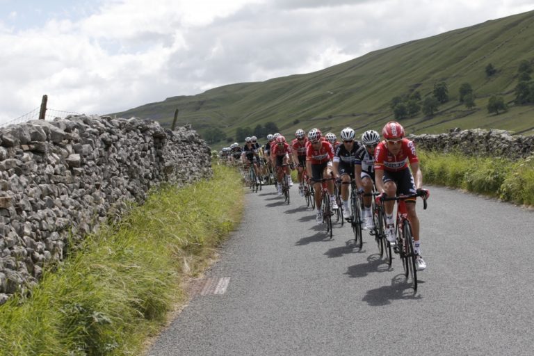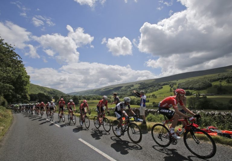 Cyklisti počas prvej etapy 101. ročníka Tour de France, ktorá merala 190,5 kilometra a viedla z Leedsu do Harrogate. Foto: SITA/AP