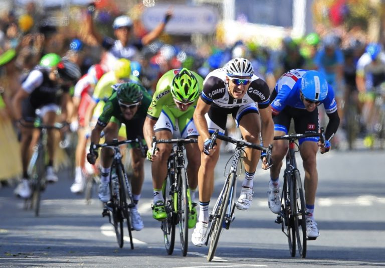 Radosť nemeckého cyklistu Marcela Kittela v cieli prvej etapy Tour de France 2014, Peter Sagan (vpravo) skončil druhý. Foto: SITA/AP
