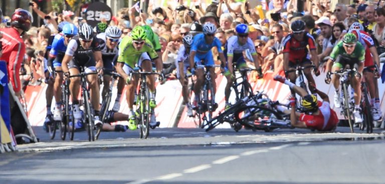 Záver prvej etapy Tour de France 2014 poznačil tesne pred cieľom pád, do ktorého sa zaplietol aj Mark Cavendish. Foto: SITA/AP