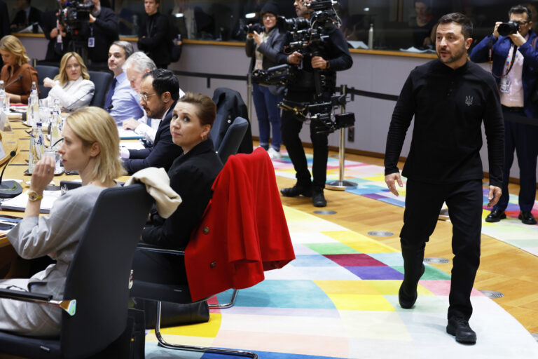 Ukraine's President Volodymyr Zelenskyy, right, arrives for a round table meeting at an EU Summit in Brussels, Thursday, March 6, 2025. (AP Photo/Geert Vanden Wijngaert)