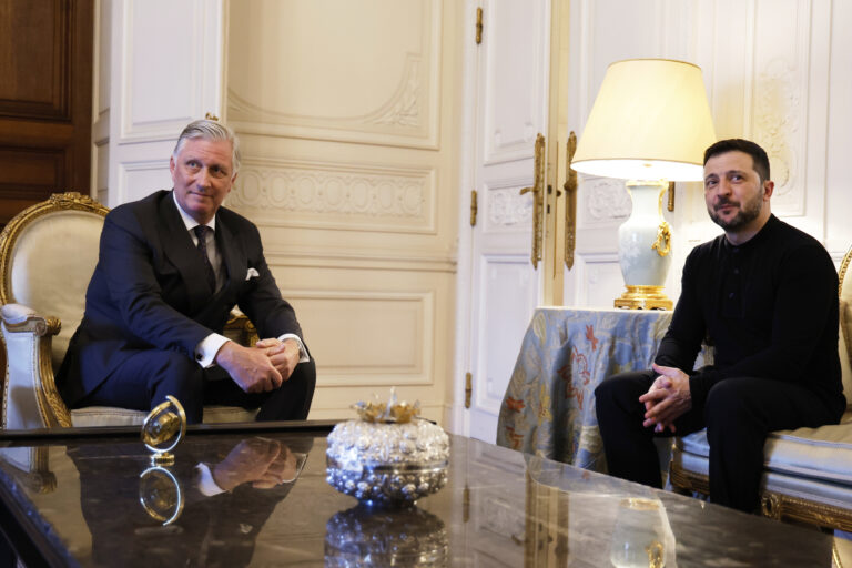 Belgium's King Philippe, left, meets with Ukraine's President Volodymyr Zelenskyy at the Royal Palace in Brussels, Thursday, March 6, 2025. (AP Photo/Geert Vanden Wijngaert, Pool)