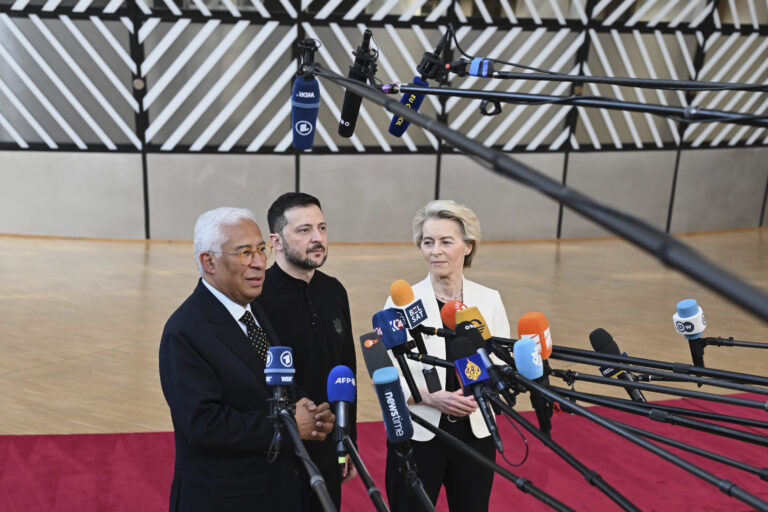 From left, European Council President Antonio Costa, Ukraine's President Volodymyr Zelenskyy and European Commission President Ursula von der Leyen speak with the media as they arrive for an EU Summit at the European Council building in Brussels, Thursday, March 6, 2025. (AP Photo/Harry Nakos)