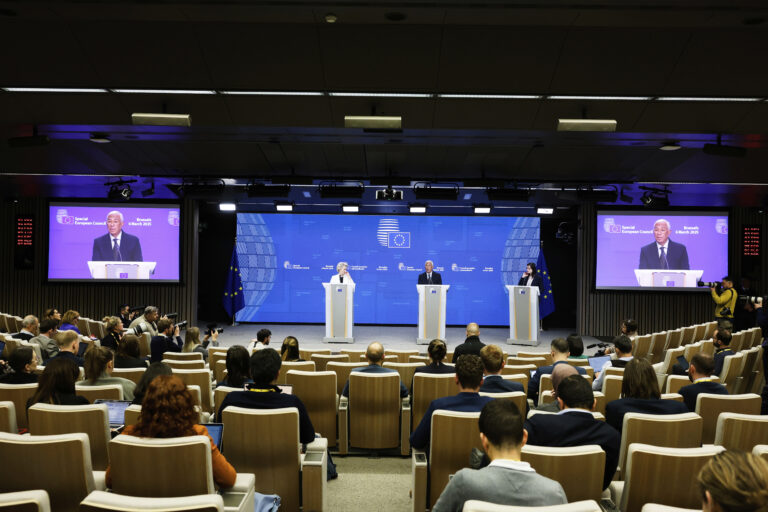 European Commission President Ursula von der Leyen, left, and European Council President Antonio Costa, center, address a media conference at an EU Summit in Brussels, Thursday, March 6, 2025. (AP Photo/Omar Havana)