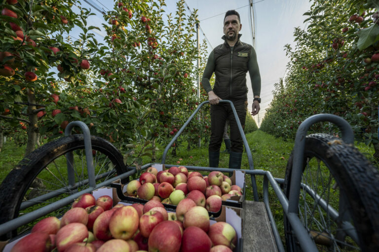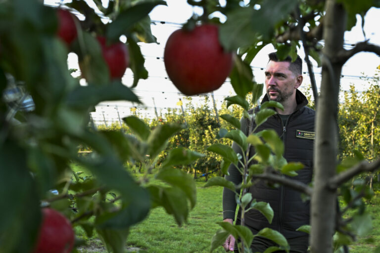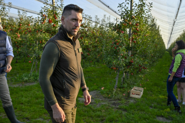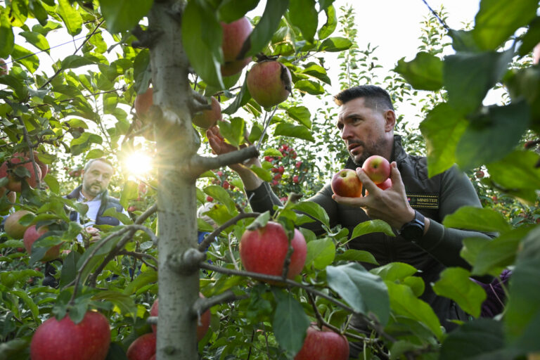 Minister pôdohospodárstva a rozvoja vidieka Richard Takáč počas samozberu jabĺk v Dunajskej Lužnej, ktoré odovzdá žiakom Základnej školy na Žitavskej ulici v Bratislave zapojenej do Školského programu. Dunajská Lužná, 20. september 2024. Foto: SITA/Milan Illík