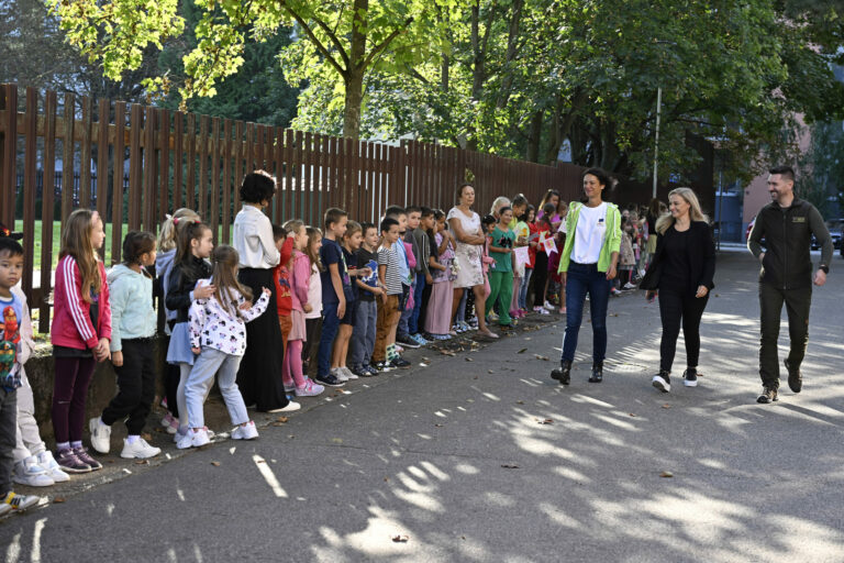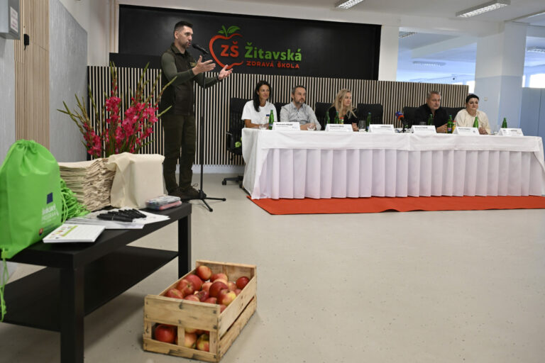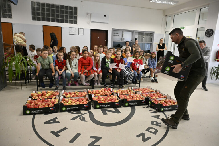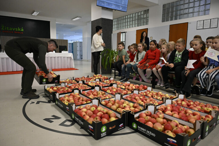 Minister pôdohospodárstva a rozvoja vidieka Richard Takáč (vľavo v pozadí) počas odovzdania jabĺk žiakom Základnej školy na Žitavskej ulici v Bratislave zapojenej do Školského programu. Bratislava, 20. september 2024. Foto: SITA/Milan Illík