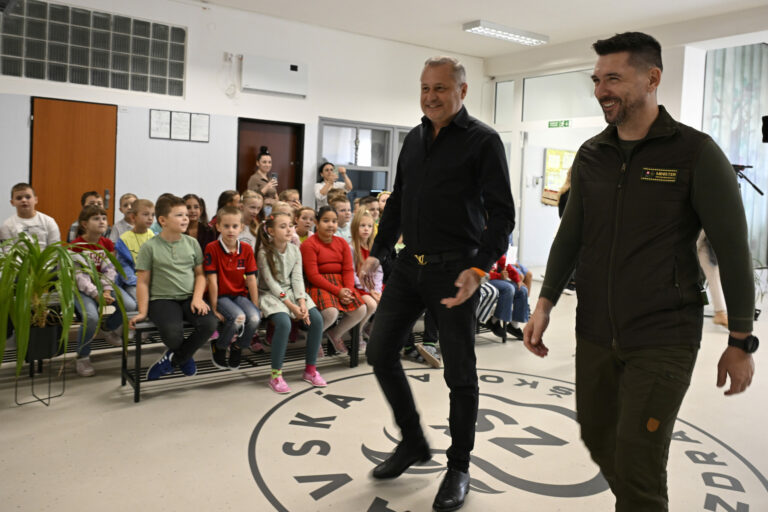 Minister pôdohospodárstva a rozvoja vidieka Richard Takáč (vpravo) počas príchodu v rámci odovzdania jabĺk žiakom Základnej školy na Žitavskej ulici v Bratislave zapojenej do Školského programu. Bratislava, 20. september 2024. Foto: SITA/Milan Illík