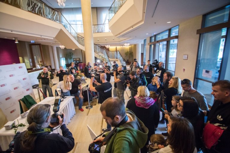 Sprava: Víťazka WTA Finals v Singapure 2016 a piata najlepšia tenistka sveta Dominika Cibulková a tréner Matej Lipták počas tlačovej besedy po návrate z WTA Finals v Singapure. Bratislava, 1. november 2016. Foto: SITA/Marko Erd