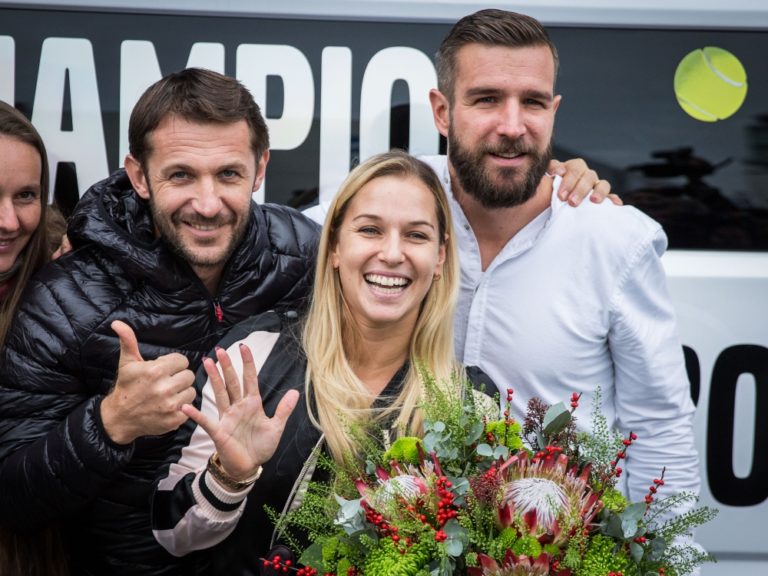 Zľava: Tréner Matej Lipták, víťazka WTA Finals v Singapure 2016 a piata najlepšia tenistka sveta Dominika Cibulková a manžel tenistky Dominiky Cibulkovej, Michal Navara po prílete na Letisko Viedeň-Schwechat. Bratislava, 1. november 2016. Foto: SITA/Marko Erd