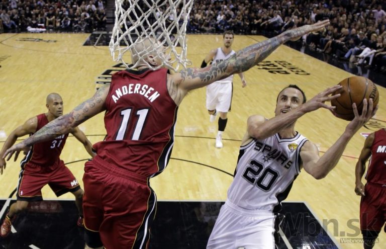 Do finálovej série tohto ročníka NBA lepšie vykročili basketbalisti San Antonia, ktorí vo štvrtkovom prvom zápase zužitkovali výhodu domácej palubovky a zvíťazili nad Miami 110:95. Manu Ginobili (20) zo San Antonia strieľa cez Chrisa Andersena (11) z Miami Heat. Foto: SITA/AP