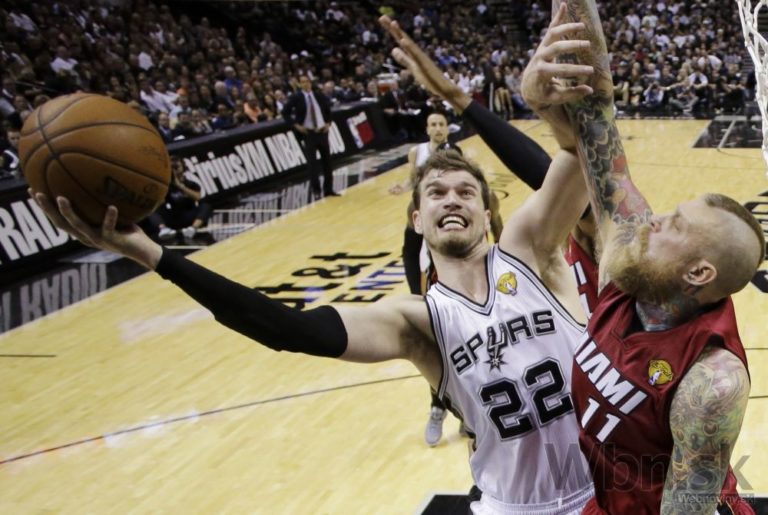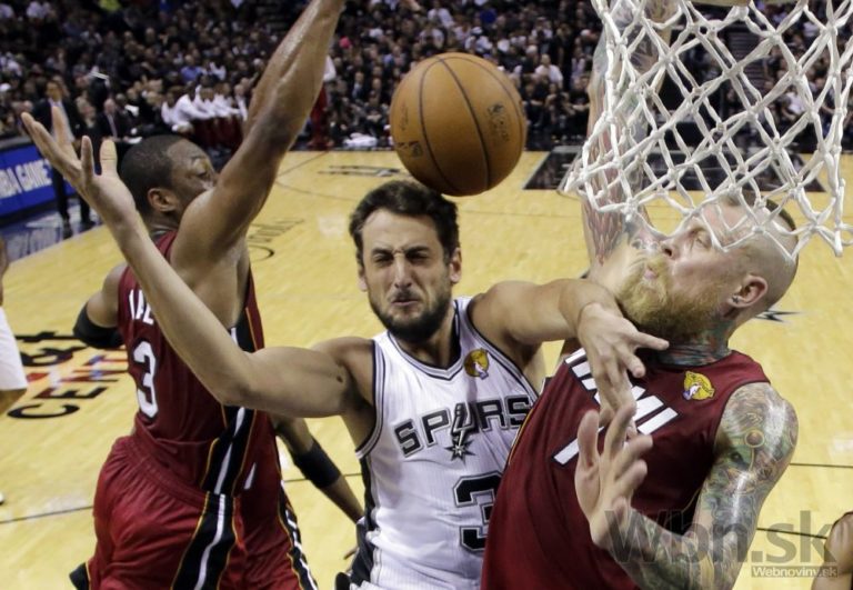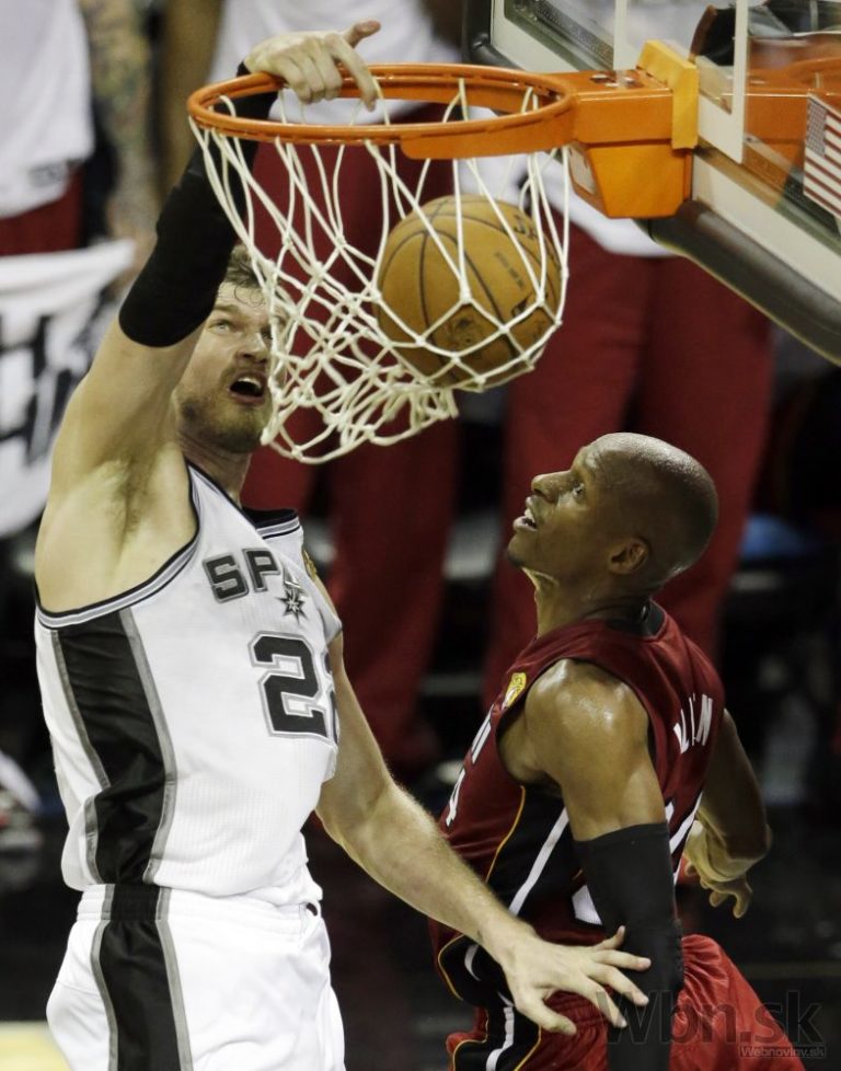 Do finálovej série tohto ročníka NBA lepšie vykročili basketbalisti San Antonia, ktorí vo štvrtkovom prvom zápase zužitkovali výhodu domácej palubovky a zvíťazili nad Miami 110:95. Tiago Splitter (22) zo San Antonia zavesil. Foto: SITA/AP