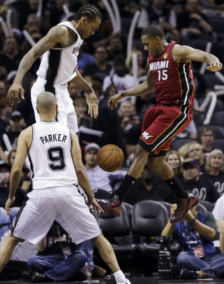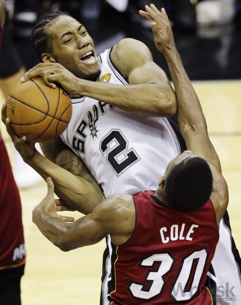 Do finálovej série tohto ročníka NBA lepšie vykročili basketbalisti San Antonia, ktorí vo štvrtkovom prvom zápase zužitkovali výhodu domácej palubovky a zvíťazili nad Miami 110:95. Kawhiho Leonarda (2) zo Spurs bráni Norris Cole (30). Foto: SITA/AP