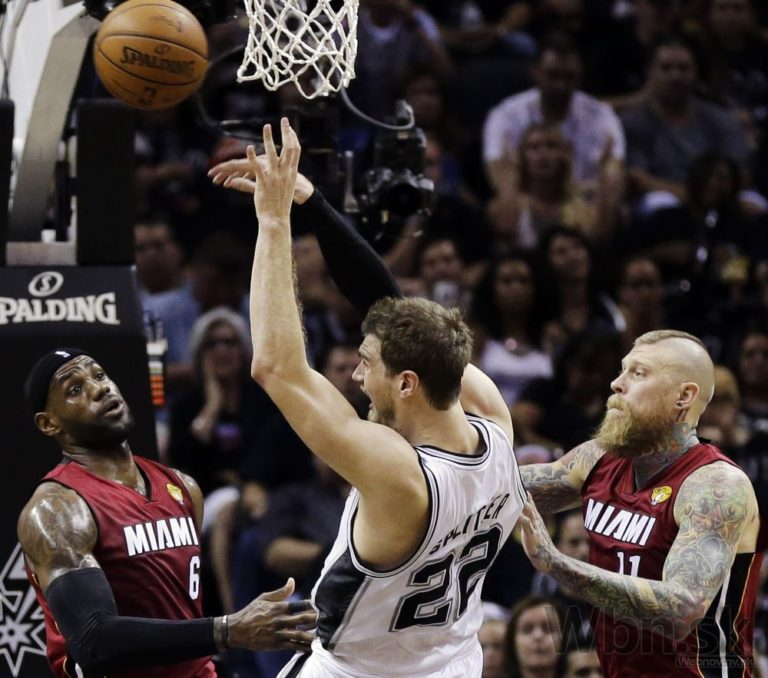 Do finálovej série tohto ročníka NBA lepšie vykročili basketbalisti San Antonia, ktorí vo štvrtkovom prvom zápase zužitkovali výhodu domácej palubovky a zvíťazili nad Miami 110:95. Tiago Splitter (22) zo San Antonia v súboji s Chrisom Andersenom (11). Foto: SITA/AP