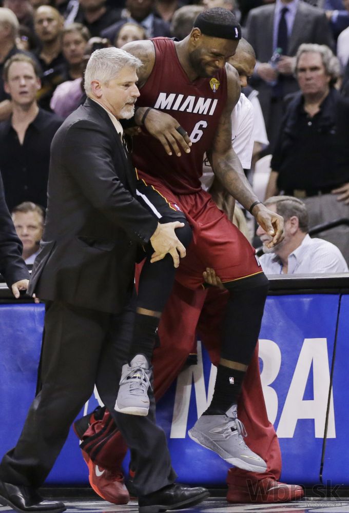 Do finálovej série tohto ročníka NBA lepšie vykročili basketbalisti San Antonia, ktorí vo štvrtkovom prvom zápase zužitkovali výhodu domácej palubovky a zvíťazili nad Miami 110:95. Zraneného LeBrona Jamesa si Miami odnáša na lavičku. Foto: SITA/AP
